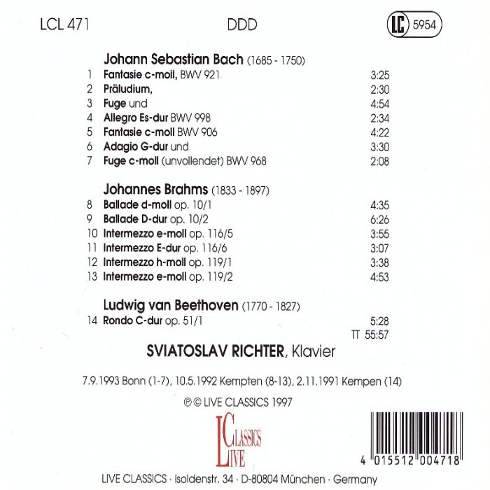 Sviatoslav Richter – Out of Later Years Vol. 1, works by J.S. Bach, Brahms and Beethoven. Richter. These live performances date from the last years of the legendary Russian pianist’s career and include a majestically performed group of seven works by Bach that he presented in Bonn in 1993 and Brahms nostalgic late intermezzos recorded the year before. As ever with Richter, it is the sheer intensity of his music-making that seizes the ear and the emotions.