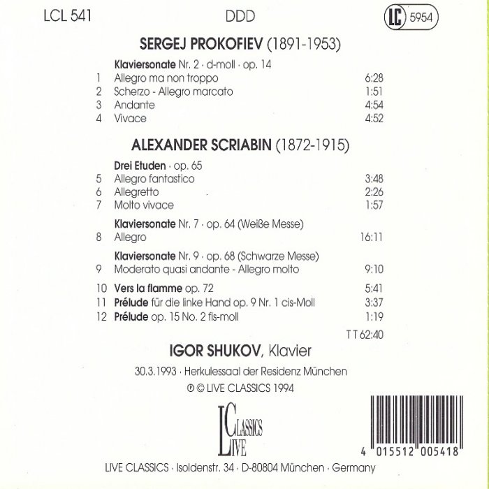 In the etudes op. 65 dated 1912 the later Scriabin becomes visible. Shukov’s play makes the awkwardly audacious harmonies and their motions in these two pieces (each of which is blended with three scanting chords) break up all boundaries. Shukov plays beyond mainstream virtuosity, beyond violent hysteria implied from the outside. He is very tense and highly concentrated.