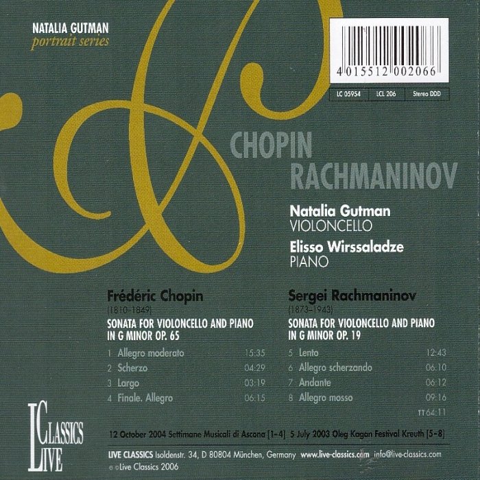 Es ist die Vehemenz im Ausdruck, die Liebe zum Detail, ja zur Ausgestaltung eines einzelnen Tons und die aus diesen Zutaten sicher gegossene und geformte Phrase, die Natalia Gutmans Cellospiel so unvergleichlich auszeichnet. Chopins 2004 mit Elisso Wirssaladze eingespielte Cellosonate ist voller Untiefen, die ein kürzer denkender Solist vielleicht übersehen und –spielen könnte. Immer wieder muss dem scheinbar selbstlaufenden Motor dieses rhapsodisch wirkenden Werkes neue Energie zugeführt werden. Die verinnerlichten langsamen Passagen auch bei der frühen Rachmaninoff-Sonate erinnern an Rostropowitschs beste Aufnahmen. Bei letztgenanntem Werk ist Wirssaladzes virtuoser Klavierpart noch weit dominanter.