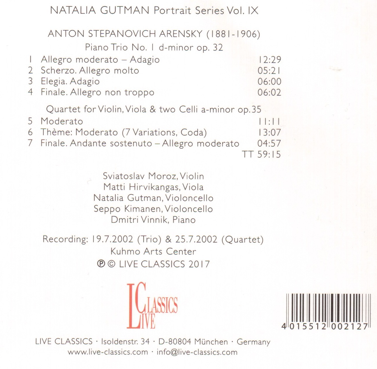There is no doubt that the cellist NATALIA GUTMAN is one of the most prominent musicians of our time. She started her career in 1959 with a Gold Medal at the World Youth Festival in Vienna followed by the Third Prize at the Tchaikovsky Competition in 1962, when she began to study with Mstislav Rostropovich at the Moscow Conservatory. With respect to her musical personality, her close friendship with Sviatoslav Richter was most influential. In 1967, the First Prize at the ARD Competition constituted the cornerstone of her international career.