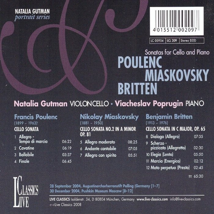 Zwei der drei eingespielten Werke auf dieser CD sind dem Cellsiten Mstislav Rostropowitsch gewidmet. Damit erinnert Natalia Gutman an ihren verehrten Lehrer. Oft und gerne spielt sie Kammermusik. Seit 2001 mit dem 1973 geborenen russischen Pianisten Viatcheslav Poprugin. Dass Kammermusik ihre große Leidenschaft ist – sie unterrichten beide gemeinsam mit Alexei Lubimov am Moskauer Konservatorium Kammermusikklassen – wird hörbar: Sie sind ein perfekt eingespieltes Team, wunderbar ausgeglichen und harmonisch. Dazu haben sie sich ein sehr interessantes Programm ausgesucht. Poulencs Sonate bezaubert mit Charme und Eleganz. Ein außergewöhnliches Werk ist die erste von insgesamt fünf Sonaten für Violoncello, die Benjamin Britten seinem engen Freund Rostropowitsch 1961 widmete. Suitenartig reiht er fünf Sätze aneinander, die musikalisch verschiedenste Ausdrucksmöglichkeiten eröffnen. Abwechslungsreiche Musik, die kalaidoskopartig das Klangspektrum des Cellos repräsentiert und von Gutman intensiv interpretiert wird. Eine besondere Überraschung ist die Sonate Nr. 2 von Nikolay Miaskovsky. „Sein Stil kombiniert Tschaikowsky und Scriabin“, so Rostropowitsch über die Musik Miaskowskys. Seine zweite Sonate op. 81 aus dem Jahr 1934 ist ein gefälliges, aber nicht weniger originelles Werk. Teilweise erinnert es an Filmmusik. Auch hier zeigen sich Gutman und Poprugin als klanglich ausgeglichenes Duo, das mit Herz und Seele spielt.