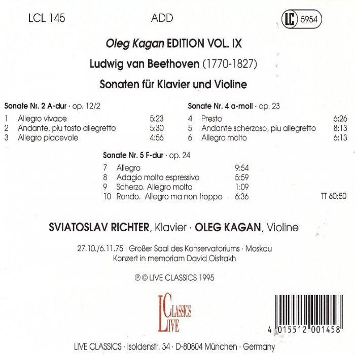 On comprend dans des trois sonates, enregistrées au cours d’une série de concerts donnés en 1975 au Conservatoire de Moscou à la mémoire de David Oistrakh, décède l’année précédente, quel prodigieux violoniste était à tout point de vue, Oleg Kagan, qui n’avait pas atteint la trentaine, quelle osmose il pouvait atteindre avec Richter dans le répertoire ‘chambriste’ qui affectionnait. Une disque magnifique!