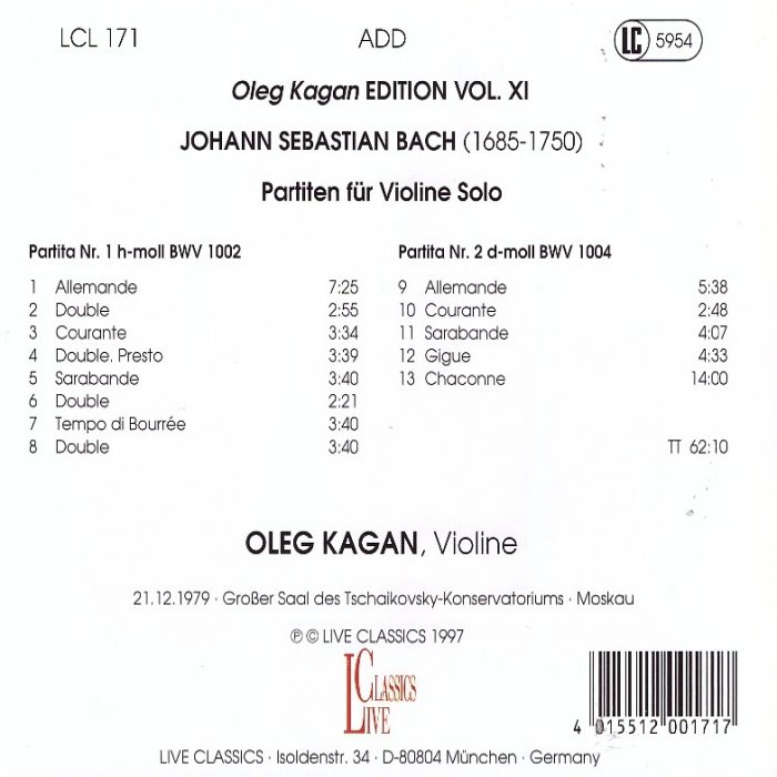 Kagan’s interpretation of the Bach works for Solo Violin constitutes in fact the focal point of his technical and musical abilities. Here, the measure of his virtually seismographical sense of style, his rejection of any kind of self-promotion through virtuosity, his profound and compelling feeling in the Adagio movements reflecting his complete devotion to the music, all of this speaks directly to our hearts.