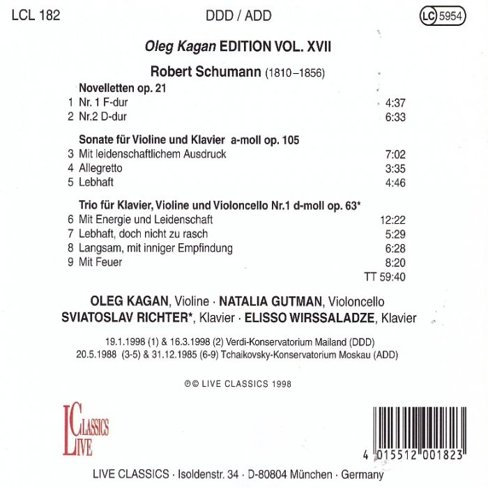 This CD will be essential for legions of Richter fans, for it preserves in more than adequate sound a live performance of Schumann’s First Piano Trio…this is the only extant reading of the score involving Richter… The performance was recorded on New Year’s Eve in 1985. It would appear from the notes that Alfred Schnittke was in the audience and relished what he heard. So should we, for it is stunning…