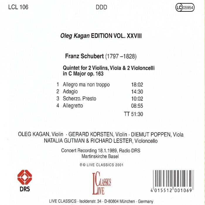 The CD of Schubert’s String Quintet, Oleg Kagan Edition Nr. XXVII, was recorded live at a concert in St. Martin’s Church in Basel just one and a half years before the death of the great Russian violinist Oleg Kagan. This Schubert interpretation enables not only a wonderful appreciation of the highly sensitive playing of Kagan and his fellow musicians but also brings a seldom encountered insight into the complexity of Schubert to be found in the legacy of his chamber music.
